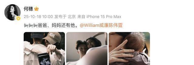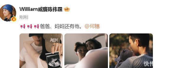 官宣中配文“爸爸、妈妈还有他”,并互相艾特了对方,同步晒出B超照片、孕期写真及新生儿合照。 三张照片中,第一张陈伟霆手中的B超照片标注日期日,胎儿至少,8个月大小。 第二张照片何穗孕肚明显,陈伟霆依偎身侧,从后抱住她。